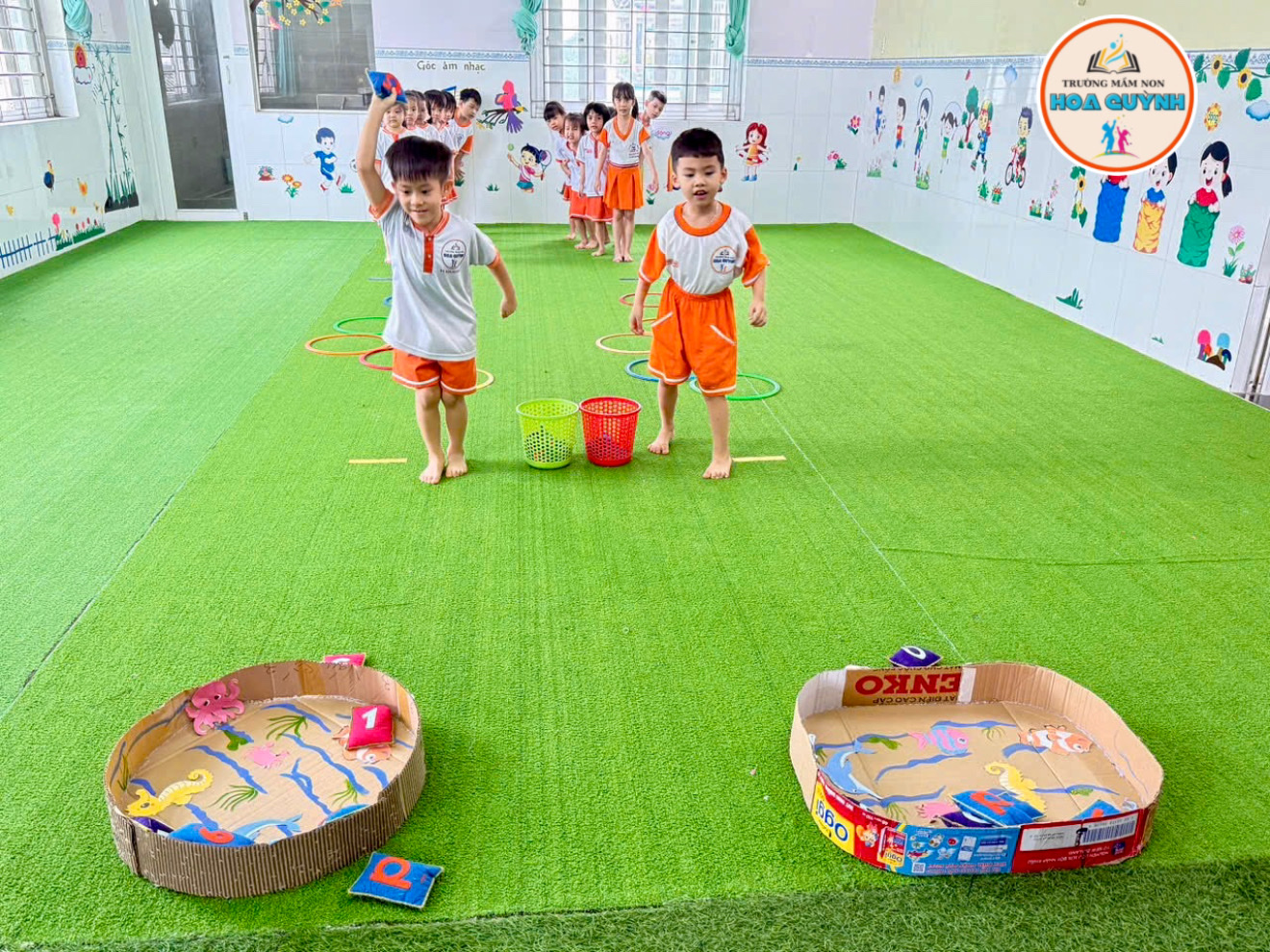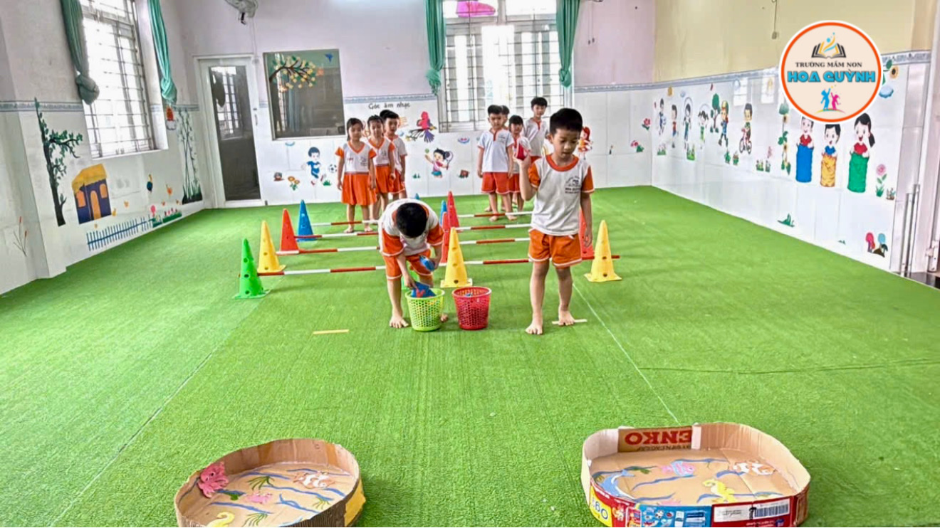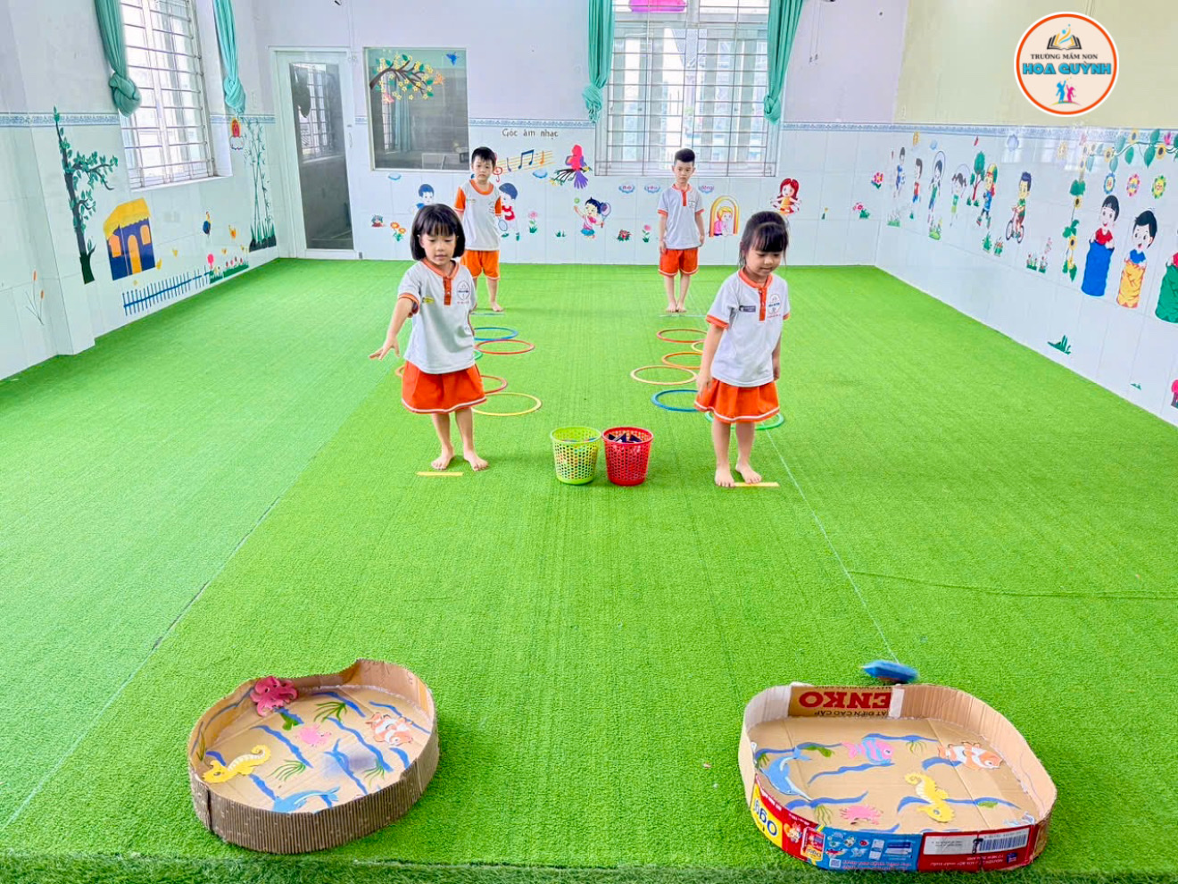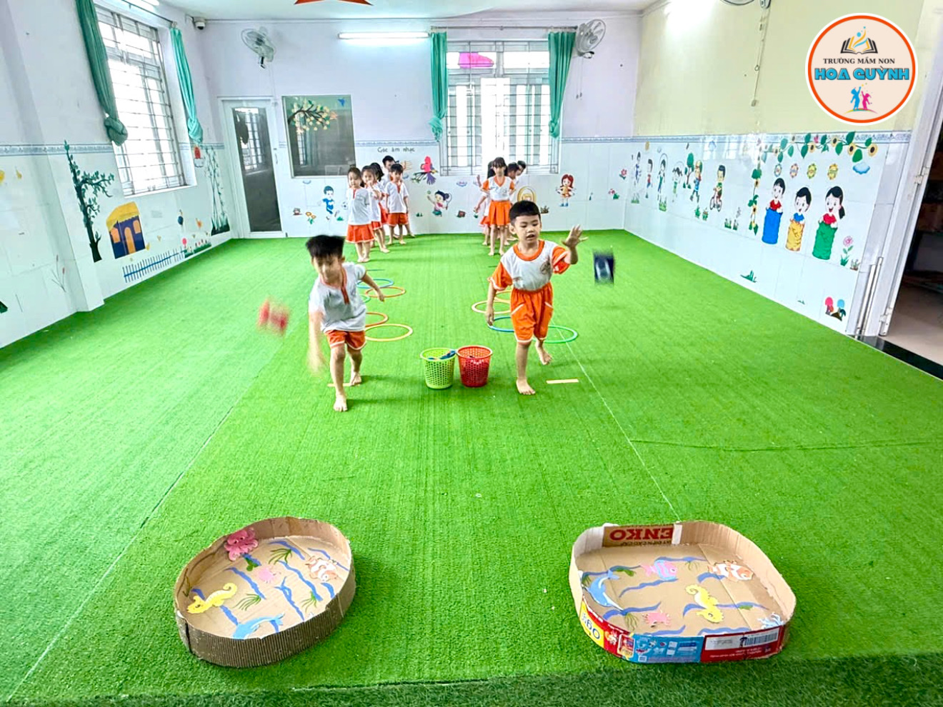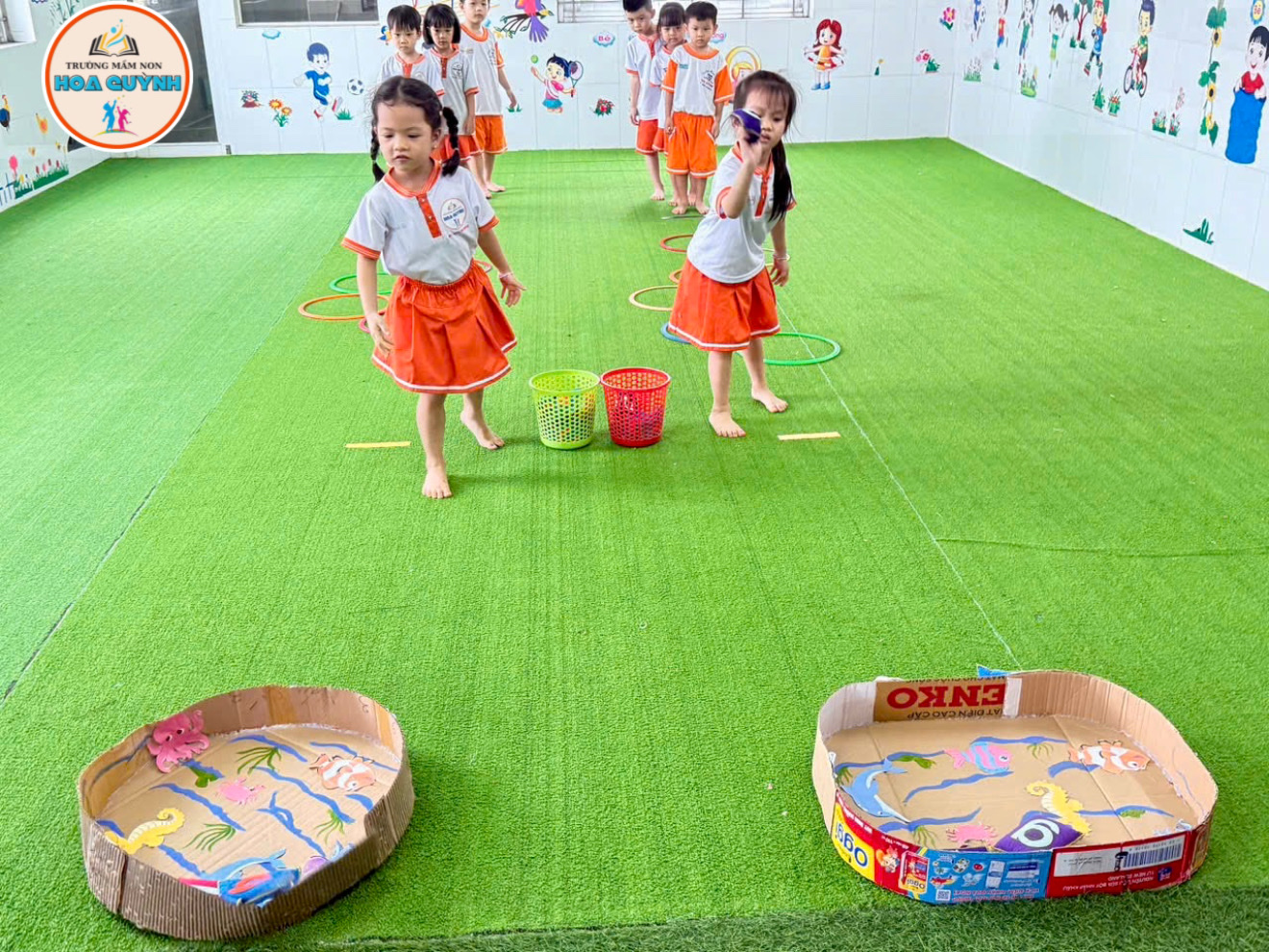🥰 Bài tập phối hợp vận động bật liên tục và ném xa qua trò chơi “Ném thức ăn cho cá” mang lại cho các bạn nhỏ khối Lá những lợi ích như: