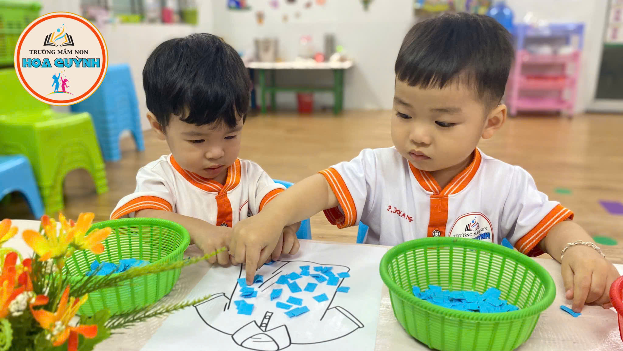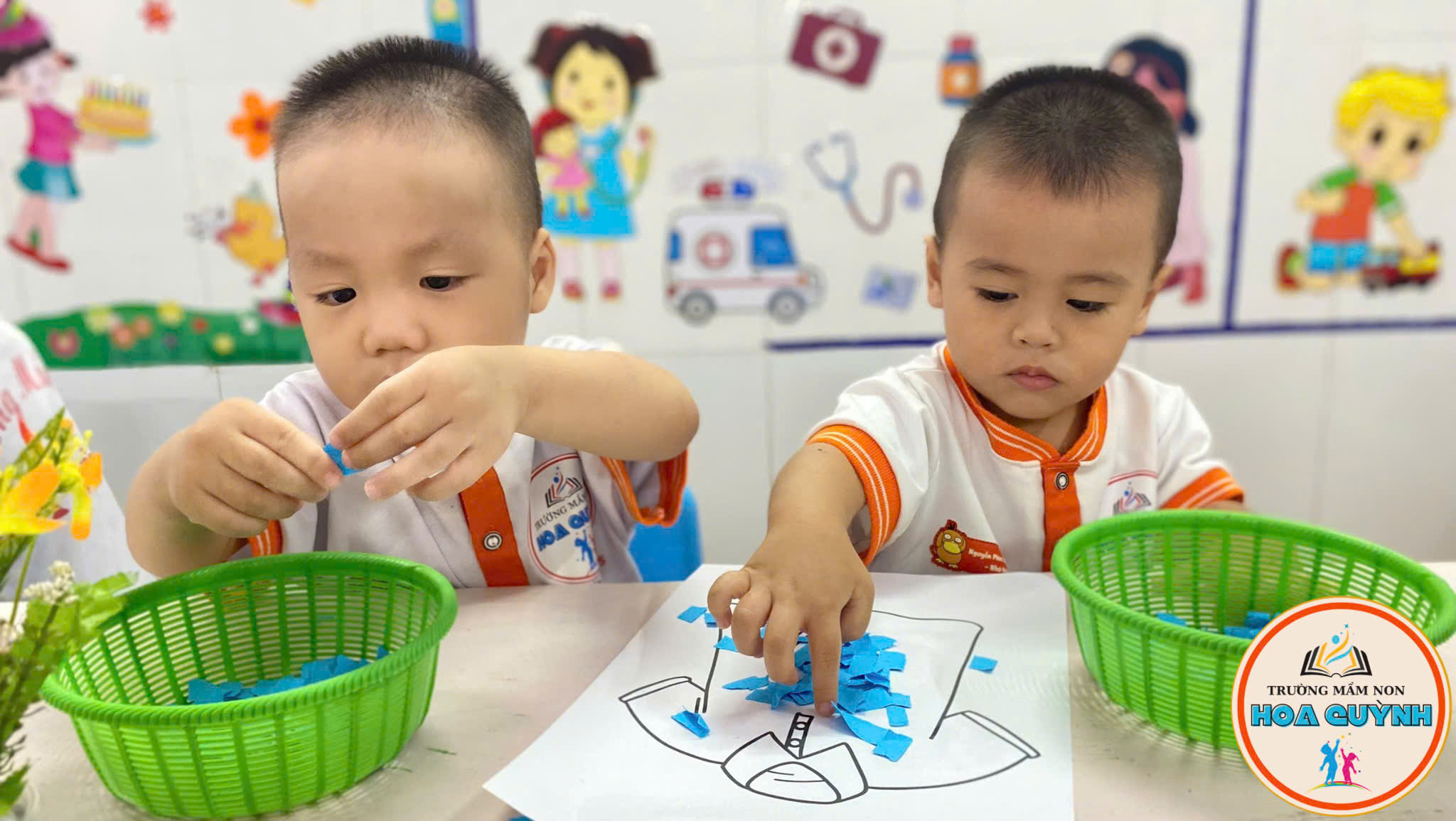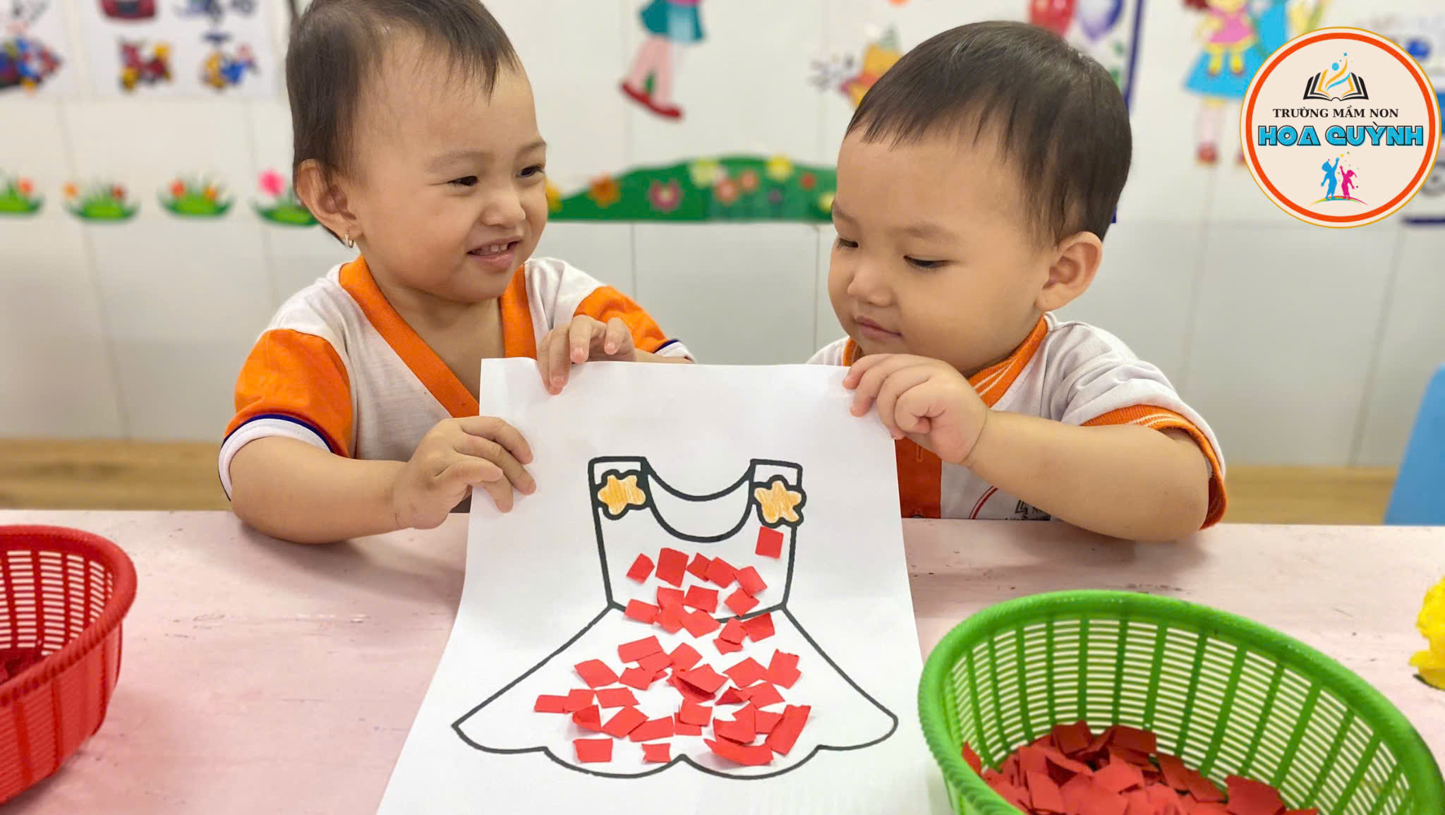 Từng bàn tay nhỏ nhắn cẩn thận xé giấy màu xanh, màu đỏ, dán lên áo – quần thật khéo 🎨 Bé vừa học vừa chơi, nhận biết màu sắc, rèn đôi tay khéo léo và thêm yêu những bộ trang phục xinh xắn của mình 💕