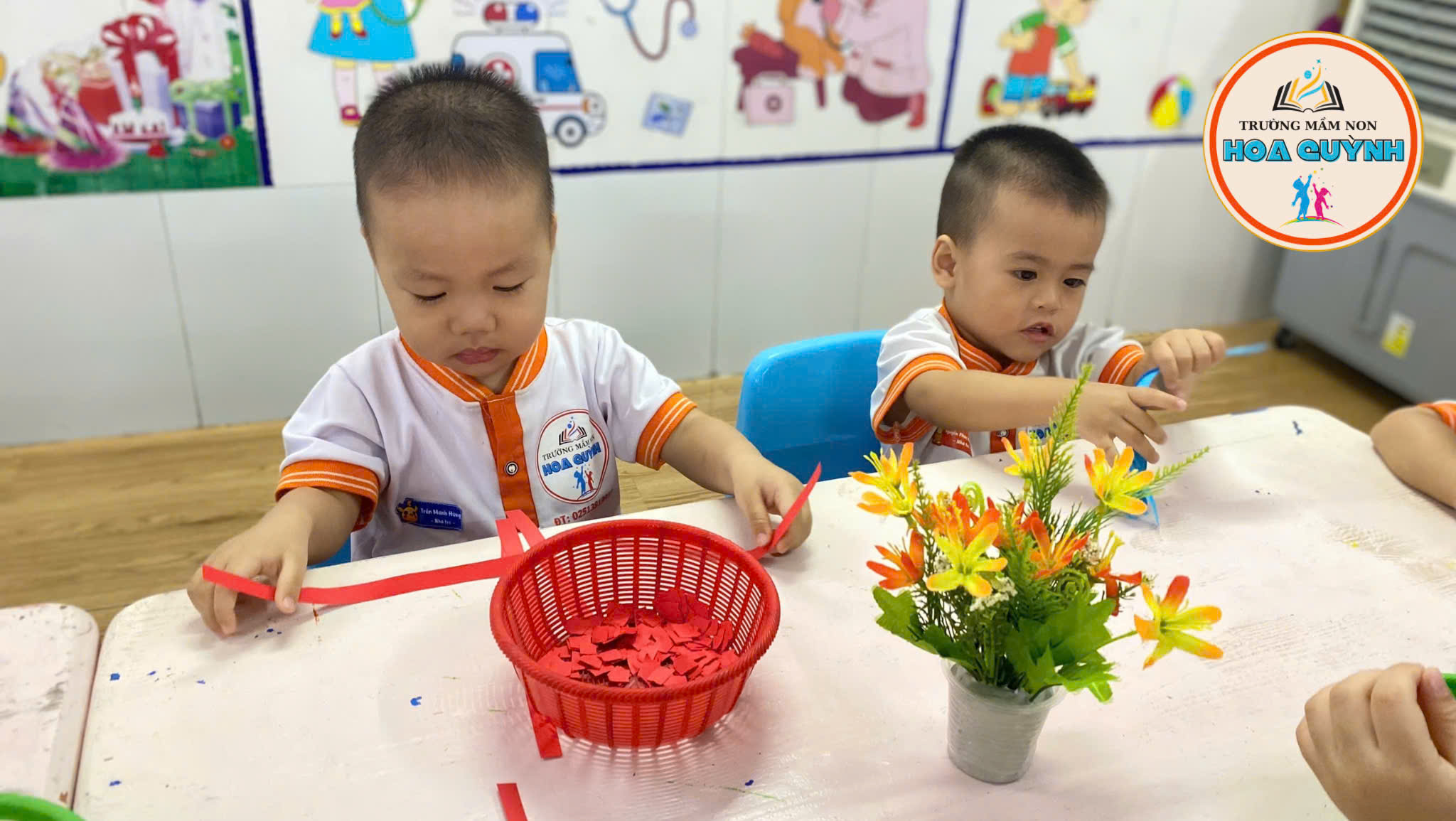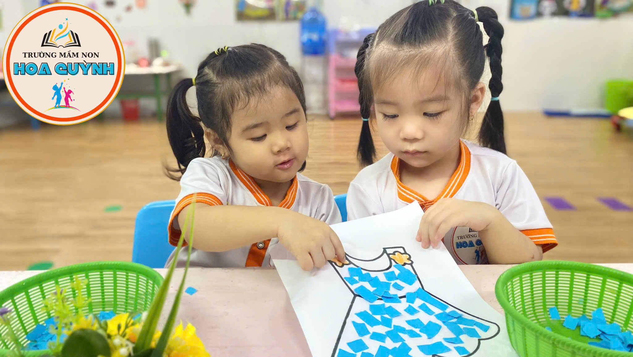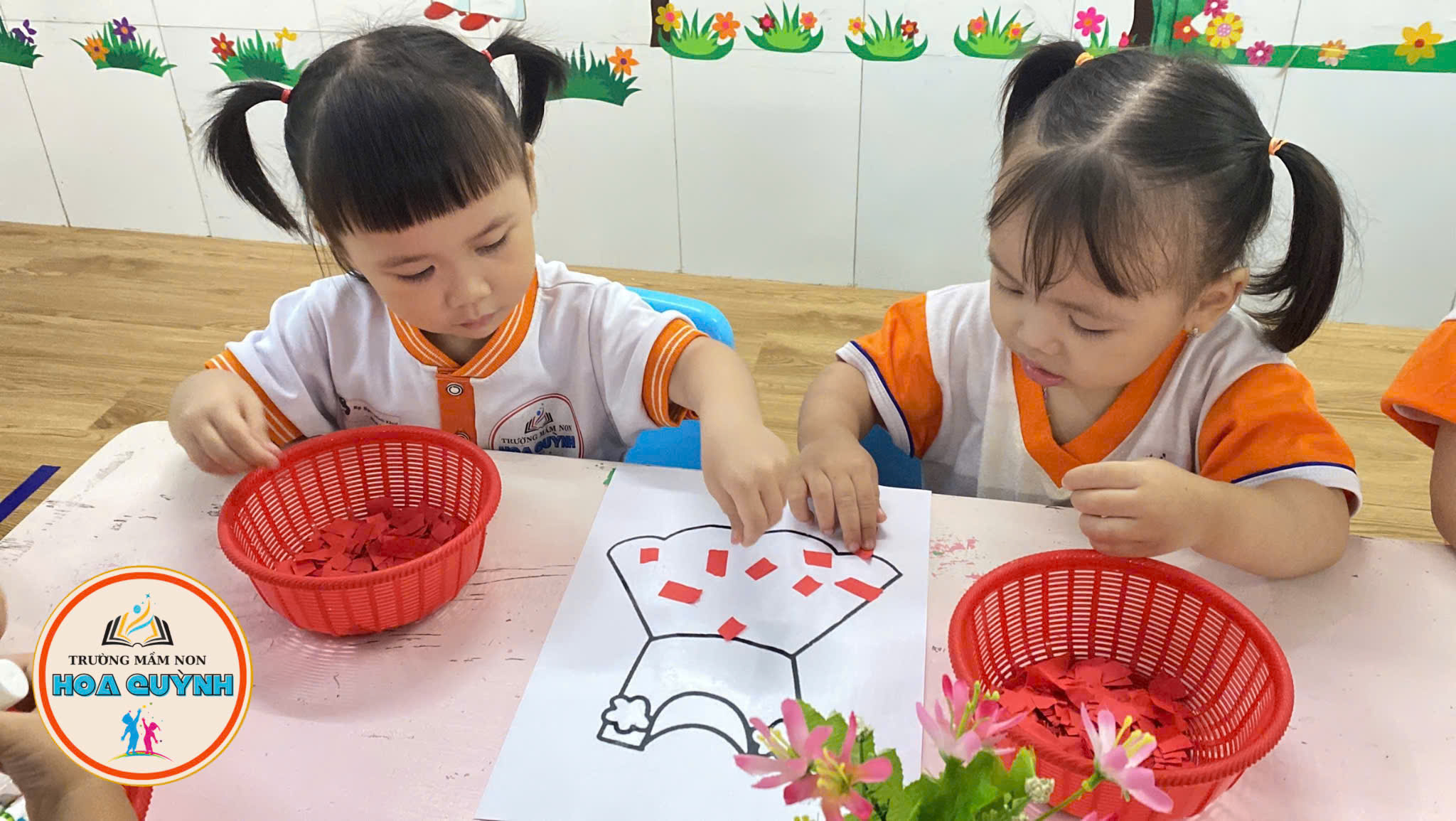 Từng bàn tay nhỏ nhắn cẩn thận xé giấy màu xanh, màu đỏ, dán lên áo – quần thật khéo 🎨 Bé vừa học vừa chơi, nhận biết màu sắc, rèn đôi tay khéo léo và thêm yêu những bộ trang phục xinh xắn của mình 💕